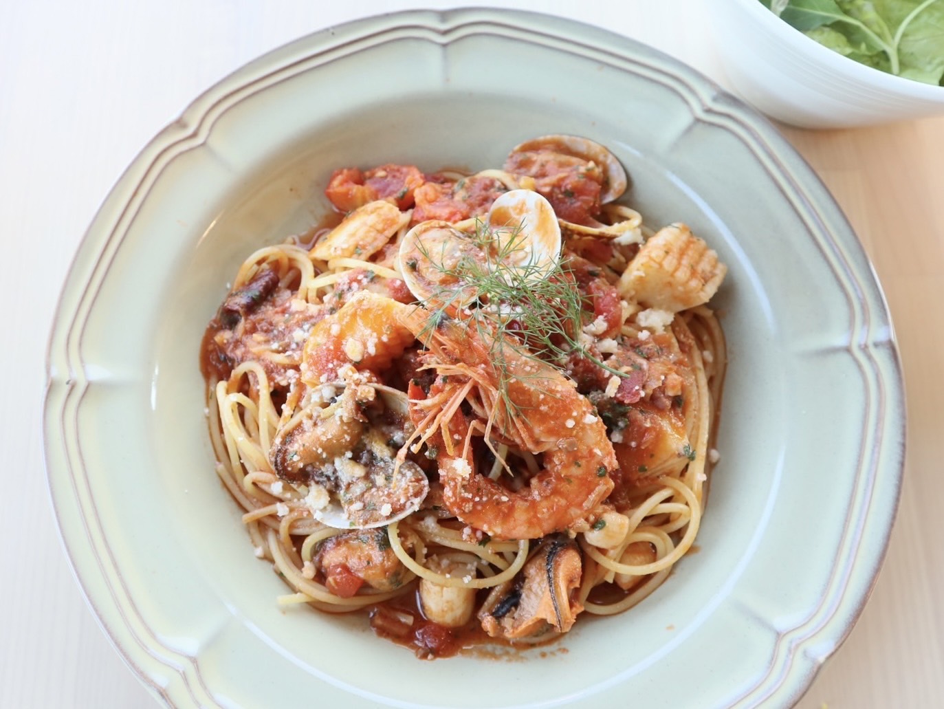有頭エビをはじめ、アサリやイカなどのシーフードが自家製トマトソースと絡まって魚介のおいしさが口いっぱいに広がるみんな大好きなパスタ。